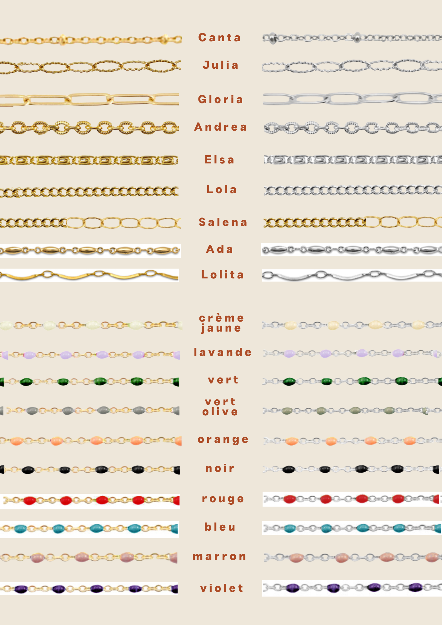 Gloria, Ada et Julia : 55cm au total et sont réglables sur toute la longueur de chaîne.